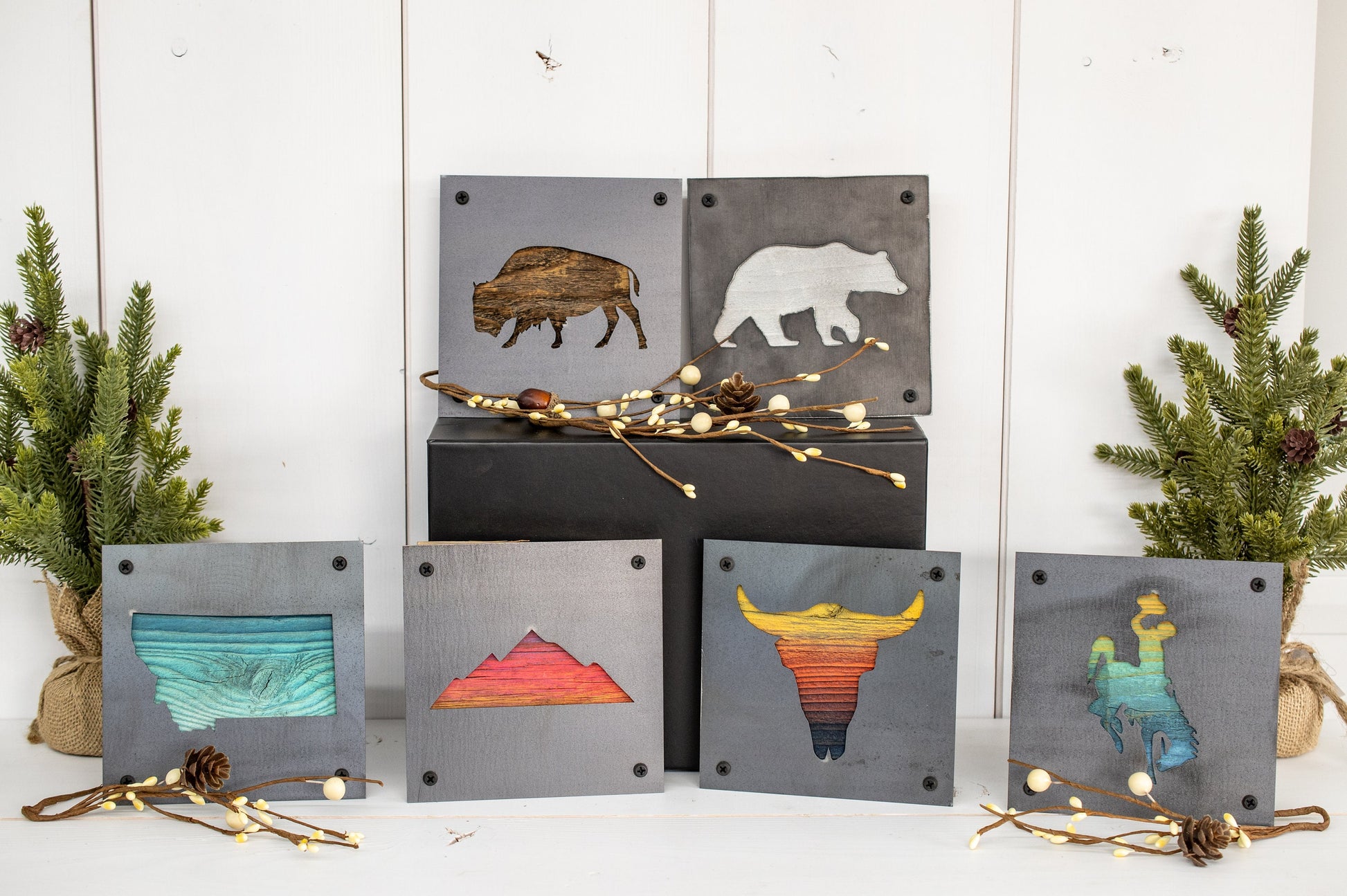 Hikers, backpackers, mountaineers and recreationalist alike, check out this great wood and metal rustic boots symbol to add to your walls. This hiking boots metal sign is part of a series of signs that we make where you can pair them together to outline all your favorite activities! These cute little signs work perfect for all the little spaces in your home or those hard to shop for people in our lives. At 5.5" wide and tall with a small hanger on the back this little piece of art is easy to hang wherever you choose.